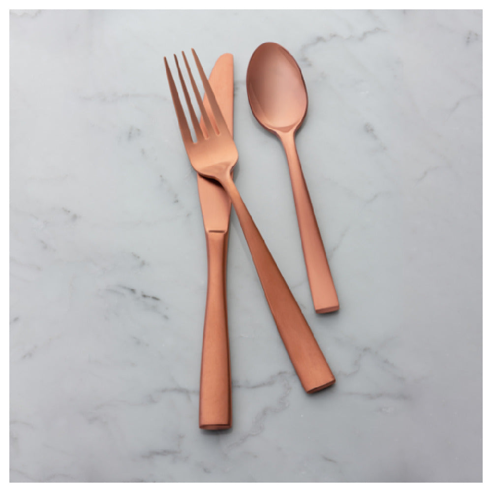 The Bon Chef S3000RGM Manhattan Teaspoon is a meticulously crafted utensil measuring 6-1/2 inches, designed to elevate dining experiences across various hospitality segments. Made from 18/10 stainless steel, this teaspoon offers exceptional durability and resistance to corrosion, ensuring longevity and consistent performance. The teaspoon is PVD coated, a process known for enhancing surface hardness and wear resistance, and features a stunning rose gold color that adds a touch of elegance to any table setting. The matte finish of the teaspoon not only provides a contemporary aesthetic but also minimizes visible fingerprints and smudges, maintaining its sophisticated appearance. Ideal for upscale restaurants, hotels, and catering services, the Bon Chef S3000RGM Manhattan Teaspoon combines functionality with a striking design, making it a versatile choice for establishments seeking to impress discerning guests. The balance and weight of this teaspoon are expertly designed to provide a comfortable and ergonomic grip, enhancing the dining experience for users. Whether utilized in fine dining settings or lavish banquets, the Bon Chef S3000RGM Manhattan Teaspoon stands out as a premium option for those aiming to deliver excellence in presentation and performance.