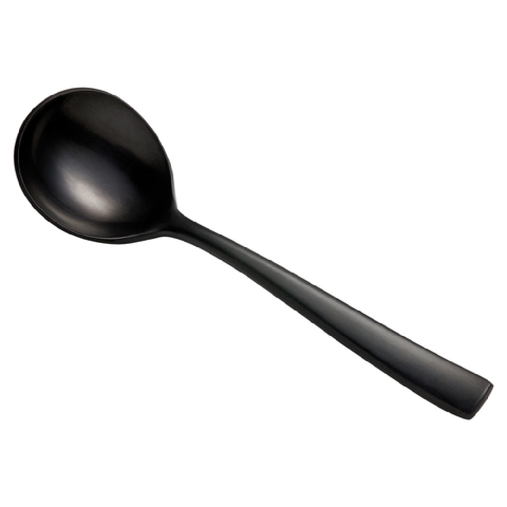 The Bon Chef S3001BM Manhattan Bouillon Spoon 6-3/8" 18/10 Stainless Steel is a meticulously crafted utensil, ideal for both professional and personal settings. This bouillon spoon is constructed from high-quality 18/10 stainless steel, a composition that ensures superior durability and resistance to corrosion, making it a lasting addition to any cutlery collection. The spoon measures 6-3/8 inches, providing a balanced and comfortable grip for users. Its PVD coated surface not only enhances its aesthetic appeal with a sleek black finish but also adds an extra layer of protection against wear and tear. The matte finish of the spoon gives it a contemporary look that complements modern table settings, making it suitable for upscale dining environments such as restaurants and hotels. This bouillon spoon is particularly advantageous for the hospitality industry, as it combines functionality with style, meeting the demands of both elegance and practicality in food presentation. The precise engineering of the Bon Chef S3001BM Manhattan Bouillon Spoon ensures it meets the high standards expected in culinary establishments, while its stylish appearance makes it a distinguished choice for those looking to elevate their tableware. This product is a testament to Bon Chef's commitment to quality and design excellence.