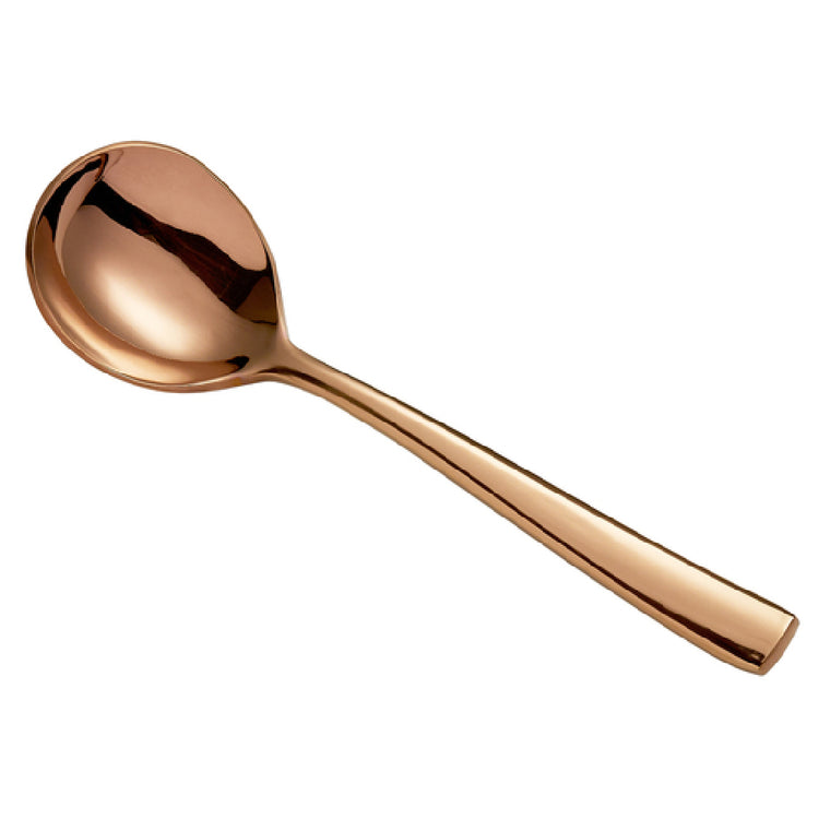 The Bon Chef S3001RG Manhattan Bouillon Spoon is a meticulously crafted piece of cutlery with a length of 6-3/8 inches. Made from high-quality 18/10 stainless steel, this spoon is designed for durability and resistance to corrosion, making it an enduring choice for both casual and formal dining experiences. Its PVD coating enhances its strength and introduces a luxurious rose gold finish that adds an elegant touch to any table setting. The mirror finish further accentuates its sleek and sophisticated design, reflecting Bon Chef's commitment to superior craftsmanship. Ideal for the hospitality industry, catering services, and upscale restaurants, this bouillon spoon not only meets aesthetic standards but also ensures functional excellence for efficient service. The combination of its robust material and stylish coating makes the Bon Chef S3001RG an asset in any culinary environment that values both performance and presentation.