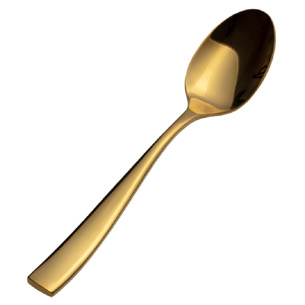 The Bon Chef S3003G Manhattan Soup/Dessert Spoon is a distinguished piece of cutlery, measuring 7-3/4 inches and crafted from 18/10 stainless steel, known for its superior corrosion resistance and lustrous appearance. This versatile spoon is PVD coated, boasting a gold hue that adds a touch of elegance to any dining setting. The mirror finish enhances its aesthetic appeal, making it an ideal choice for upscale restaurants, hotels, and fine dining establishments. Its size and shape are perfect for serving both soups and desserts, catering to diverse culinary presentations. The Bon Chef S3003G not only combines practicality with style but also represents a durable investment for foodservice professionals seeking high-quality flatware. The gold PVD coating not only contributes to its visual allure but also provides an additional layer of protection, ensuring longevity and maintaining its pristine look even with frequent use. This expertly designed spoon complements sophisticated table settings, making it an attractive option for event planners and caterers aiming to impress their clients with exquisite attention to detail. Whether used in a bustling restaurant environment or at an elegant banquet, the Bon Chef S3003G Manhattan Soup/Dessert Spoon stands out as a reliable and stylish utensil choice.