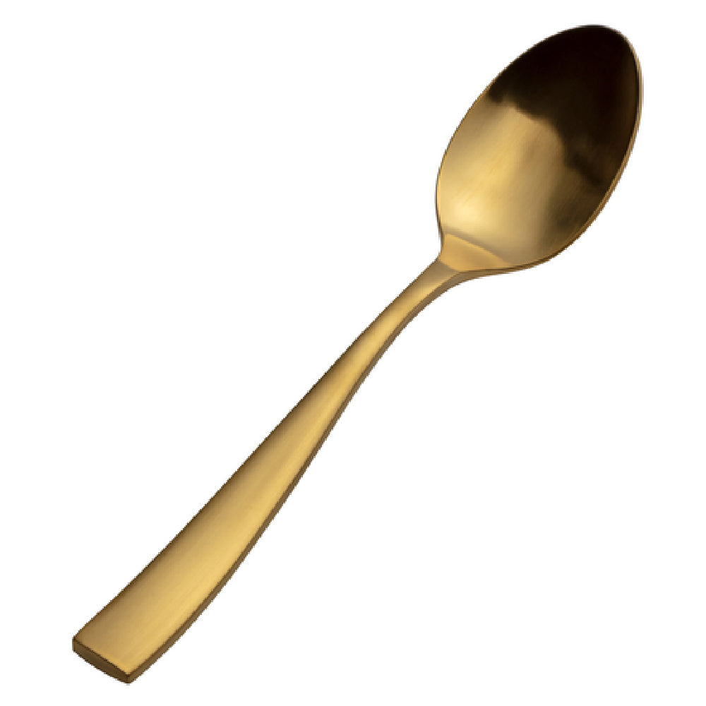 The Bon Chef S3003GM Manhattan Soup/Dessert Spoon 7-3/4" 18/10 Stainless Steel is a versatile utensil, meticulously crafted to enhance dining experiences across various settings. With a length of 7-3/4 inches, this spoon is designed to be the perfect companion for both soups and desserts, providing a comfortable and balanced grip for users. Made from high-quality 18/10 stainless steel, it guarantees durability and resistance to corrosion, ensuring a long-lasting addition to any cutlery collection. The spoon's PVD coating in a sophisticated gold hue adds a touch of luxury and elegance, making it suitable for upscale dining environments, while the matte finish delivers a modern aesthetic appeal. This combination of functionality and design makes the Bon Chef S3003GM spoon ideal for restaurants, hotels, and catering services seeking to impress their guests with both style and substance. Whether used in a bustling restaurant or a formal event setting, this spoon's sturdy construction and eye-catching finish ensure it meets the high standards required in the hospitality industry. The Bon Chef S3003GM Manhattan Soup/Dessert Spoon stands out not only for its practicality but also for its ability to complement and elevate any table setting.
