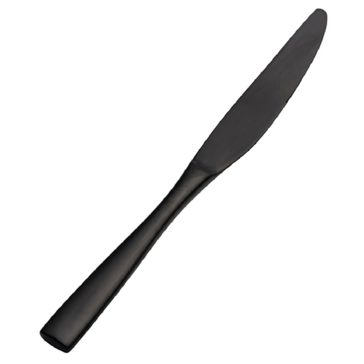 The Bon Chef S3011BM Manhattan Dinner Knife 9" Solid Handle is a meticulously designed piece of cutlery that combines elegance and functionality. This dinner knife features a solid handle construction, ensuring durability and a comfortable grip for users. Measuring 9 inches in length, it is crafted from high-quality 13/0 stainless steel, known for its resistance to rust and corrosion, making it ideal for both residential and commercial dining settings. The knife is PVD (Physical Vapor Deposition) coated, which enhances its surface hardness and provides a distinctive black, matte finish that adds a touch of sophistication to any table setting. This aesthetic appeal is coupled with the knife's practical benefits, making it suitable for upscale restaurants, hotels, and catering services that prioritize both style and utility. The Bon Chef S3011BM Manhattan Dinner Knife not only complements existing tableware collections but also stands out as a statement piece on its own. It harmonizes contemporary design with robust performance, catering to diverse market segments within the hospitality industry that demand both elegance and efficiency in their dining implements.