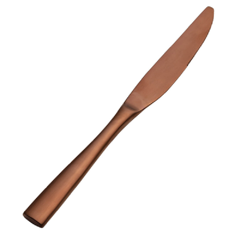 The Bon Chef S3011RGM Manhattan Dinner Knife 9" Solid Handle is a meticulously designed utensil that marries style and functionality, making it a remarkable addition to any dining setting. This knife features a substantial 9-inch solid handle, offering an ergonomic and balanced grip that enhances the dining experience. Crafted from premium 13/0 stainless steel, it ensures durability and resistance to corrosion, making it ideal for both high-end restaurants and home use. The knife is adorned with a sophisticated PVD coating in a rose gold hue, adding a touch of elegance and luxury to its appearance. Its matte finish not only enhances its aesthetic appeal but also provides a smooth and comfortable hold. This product is particularly suited for upscale dining establishments seeking to elevate their table settings with a touch of opulence and modernity. The Bon Chef S3011RGM Manhattan Dinner Knife is designed to cater to various culinary environments, offering a unique value proposition with its blend of durability, style, and functionality. With its striking design and robust construction, this dinner knife is a testament to Bon Chef's commitment to quality and innovation in the cutlery industry.