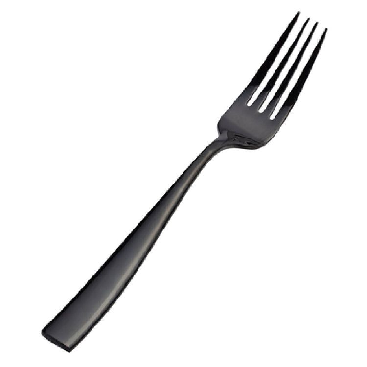 The Bon Chef S3017B Manhattan European Dinner Fork is an elegantly designed utensil, measuring 8-3/8 inches in length and crafted from high-quality 18/10 stainless steel, making it a premier choice for diverse dining environments. This particular fork is PVD coated, ensuring enhanced durability and a striking aesthetic with its sleek black, mirror finish. The design embodies the perfect blend of form and function, catering to the refined tastes of upscale restaurants, luxury hotels, and exclusive catering services that require both style and resilience in their tableware. The superior 18/10 stainless steel composition offers excellent resistance to corrosion and staining, providing long-lasting performance and maintenance ease, essential for high-turnover food service operations. The European style of this dinner fork, characterized by its larger size compared to standard dinner forks, adds a touch of sophistication and is particularly suited for fine dining establishments aiming to provide an elevated dining experience. The Bon Chef S3017B Manhattan European Dinner Fork exemplifies the commitment to excellence in craftsmanship and design, making it an ideal selection for those in the hospitality industry seeking to enhance their table settings with premium cutlery that delivers both aesthetic appeal and practical utility.