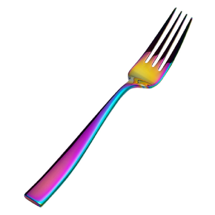 The Bon Chef S3017RB Manhattan Euro Dinner Fork is an elegant and durable dining utensil, crafted for both aesthetic appeal and functionality. With a precise length of 8-3/8 inches, this fork is designed to complement a range of table settings, whether in upscale restaurants or at home dining experiences. Made from 18/10 stainless steel, it stands out with its superior resistance to corrosion and tarnishing, ensuring longevity and repeated use without losing its shine. The fork is PVD coated, adding a layer of protection and giving it a unique rainbow finish that enhances its visual appeal. This combination of high-quality materials and stylish design makes the Bon Chef S3017RB Manhattan Euro Dinner Fork a versatile choice, suitable for catering to the needs of various dining environments within the hospitality industry. The fork's design is not only about luxury but also about providing a reliable tool for diners, ensuring every meal is enjoyed with the highest standards of dining excellence. This fork integrates seamlessly into both contemporary and traditional table settings, making it a valuable addition to any service looking for a blend of beauty, durability, and innovative design.