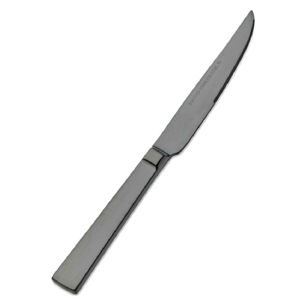 The Bon Chef S3715B Roman Steak Knife is a meticulously crafted culinary tool, measuring 9-1/2 inches in length and constructed from 13/0 stainless steel, known for its resistance to corrosion and impressive durability. This steak knife's sleek black design complements its robust functionality, making it a versatile addition to any dining setting. The blade's precise engineering ensures a sharp, clean cut, enhancing the dining experience for steak lovers. Designed for the food service industry, the Bon Chef S3715B is ideal for upscale restaurants seeking a balance between aesthetic appeal and practical utility. The knife's design not only caters to high-end dining establishments but also suits catering businesses and home kitchens that prioritize quality and style in their cutlery collection. With its superior construction and elegant appearance, the Bon Chef S3715B Roman Steak Knife stands out as a reliable choice for those looking to enhance their culinary presentation. The use of 13/0 stainless steel ensures longevity and ease of maintenance, while the knife's length provides comfort and precision in handling. This product is not just a utensil, but a statement piece that emphasizes Bon Chef's commitment to quality and innovation in the cutlery industry.