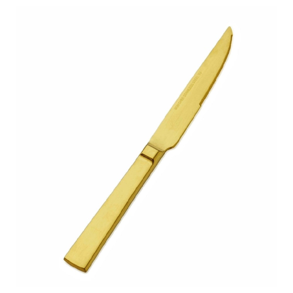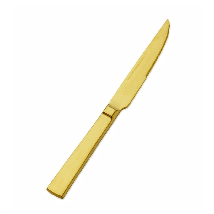 The Bon Chef S3715GM Roman Steak Knife is a precision-crafted utensil, measuring 9-1/2 inches in length, ideal for both professional and personal dining experiences. Constructed from high-quality 13/0 stainless steel, this steak knife offers a perfect balance of durability and resistance to corrosion, ensuring longevity and consistent performance. The gold matte finish not only adds a touch of elegance but also enhances the grip, making it a visually appealing choice for upscale dining establishments and home culinary enthusiasts alike. Its robust construction provides superior cutting performance, seamlessly slicing through meats with ease, making it an indispensable tool for steak lovers. This knife caters to diverse market segments, from restaurant owners seeking reliable and stylish cutlery to home chefs desiring a touch of luxury in their everyday table settings. The Bon Chef S3715GM Roman Steak Knife stands out with its unique combination of form and function, embodying both aesthetic appeal and practical utility. Its aesthetic design complements a variety of table settings, enhancing the dining experience while maintaining functionality. Whether for high-end restaurants, catering services, or home dining, this steak knife delivers exceptional quality, making it a valuable addition to any cutlery collection.