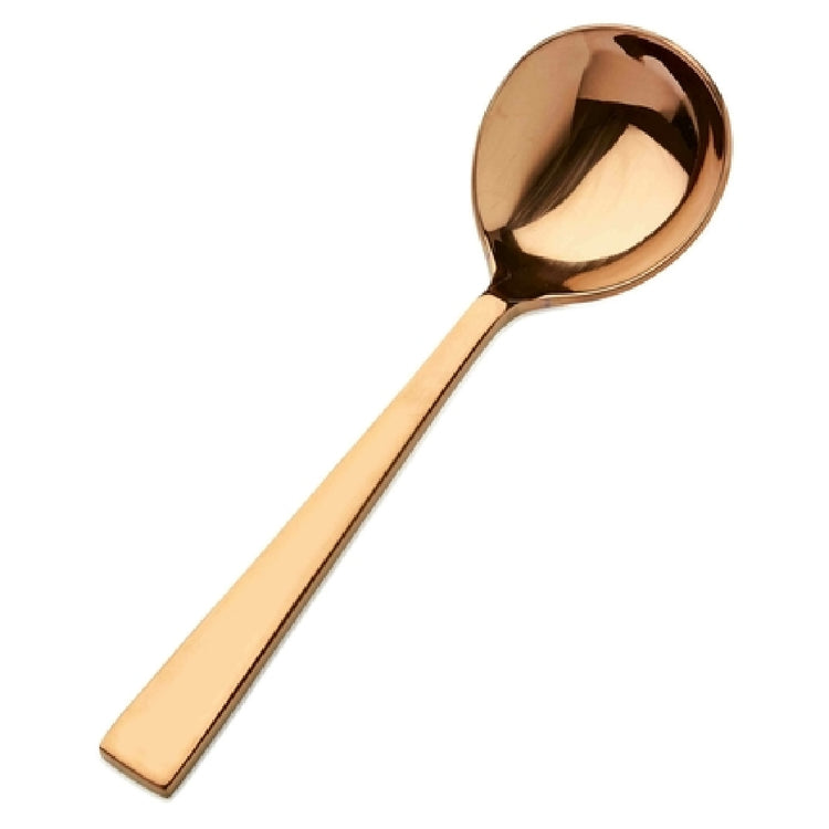 The Bon Chef S3722RG Roman Soup Spoon is a meticulously crafted utensil measuring 6-5/8 inches, designed to elevate dining experiences with its elegant round shape. Manufactured from premium 18/10 stainless steel, this spoon combines exceptional durability with a stunning aesthetic, ensuring it withstands the rigors of both commercial and home kitchen environments. The rose gold finish of the spoon adds a touch of sophistication and luxury, appealing to upscale dining establishments and discerning home chefs alike. This distinctive coloration not only enhances table presentations but also complements a wide array of dinnerware styles, making it a versatile choice for various culinary settings. The precise engineering behind the Bon Chef S3722RG guarantees a comfortable grip and efficient functionality, ideal for savoring soups and broths with ease. Its high-quality construction ensures resistance to corrosion and staining, offering long-lasting performance and maintaining its pristine appearance over time. Whether used in five-star restaurants or at family gatherings, the Roman Soup Spoon embodies a blend of style and practicality, making it a sought-after addition to any cutlery collection. Its unique features and design cater to diverse market segments, from professional chefs to culinary enthusiasts, seeking both beauty and utility in their dining utensils.