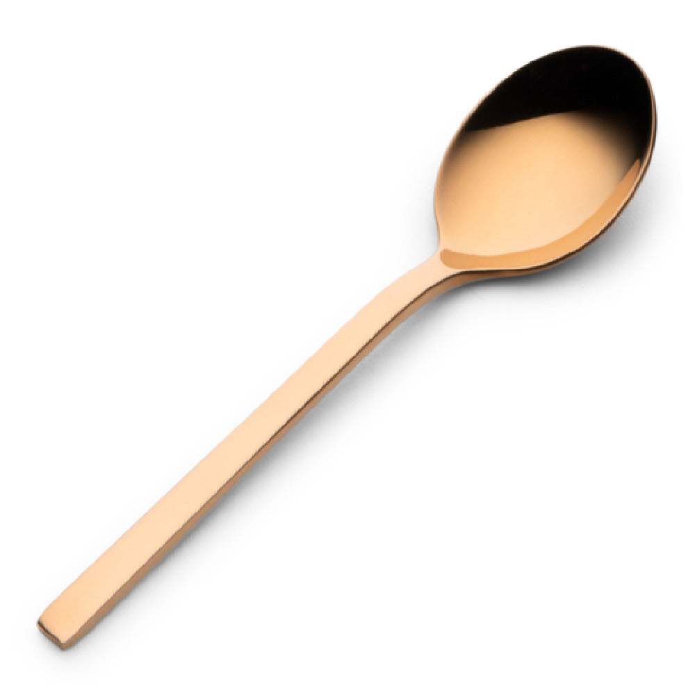 The Bon Chef S3800RG Milan Teaspoon 5.5" is a sophisticated piece crafted from 18/10 stainless steel, renowned for its high corrosion resistance and durability, making it an ideal choice for premium dining experiences. This teaspoon is PVD coated, providing a striking rose-gold hue that adds a touch of luxury to any table setting. The mirror finish ensures an elegant shine, enhancing its appeal to both high-end restaurants and upscale home dining environments. At 5.5 inches, it offers a balanced and comfortable grip, designed for both aesthetic and functional excellence. The Bon Chef S3800RG Milan Teaspoon is particularly suited for establishments that prioritize both style and durability, catering to segments such as fine dining restaurants, luxury hotels, and event catering services. Its build quality and design align with the needs of hospitality professionals seeking long-lasting flatware with a unique and stylish appearance. The rose-gold finish provides a distinctive touch that can elevate a dining presentation, making it a standout choice for places looking to distinguish their service with a touch of elegance. This teaspoon reflects a blend of modern design and practical functionality, catering to both commercial and private dining settings seeking elegance and reliability in their flatware collection.