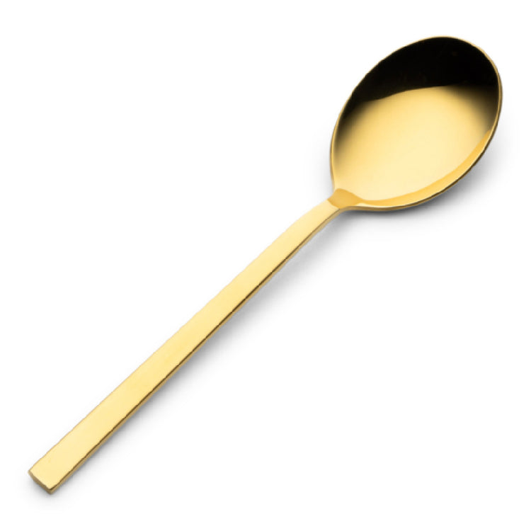 The Bon Chef S3803G Milan Bouillon Spoon is a premium utensil designed for discerning culinary professionals and enthusiasts. Measuring 7.13 inches, this spoon is crafted from 18/10 stainless steel, signifying a blend of 18% chromium and 10% nickel, which enhances its durability and resistance to rust and corrosion. The PVD coated gold finish provides a luxurious aesthetic, while its mirror finish adds an extra layer of elegance, making it a standout piece in any table setting. This spoon is particularly suited for high-end restaurants and catering services that demand both style and functionality. The unique design of the Milan Bouillon Spoon ensures comfortable handling and an optimal dining experience, providing a perfect balance between form and function. Its high-quality construction makes it ideal for repeated use in busy food service environments, while its striking appearance appeals to upscale dining establishments looking to elevate their presentation. The Bon Chef S3803G is not just a spoon, but a statement piece that complements sophisticated culinary environments, offering a blend of aesthetic appeal and practical utility. This spoon is a testament to Bon Chef's commitment to superior craftsmanship and innovation in the field of fine dining utensils.
