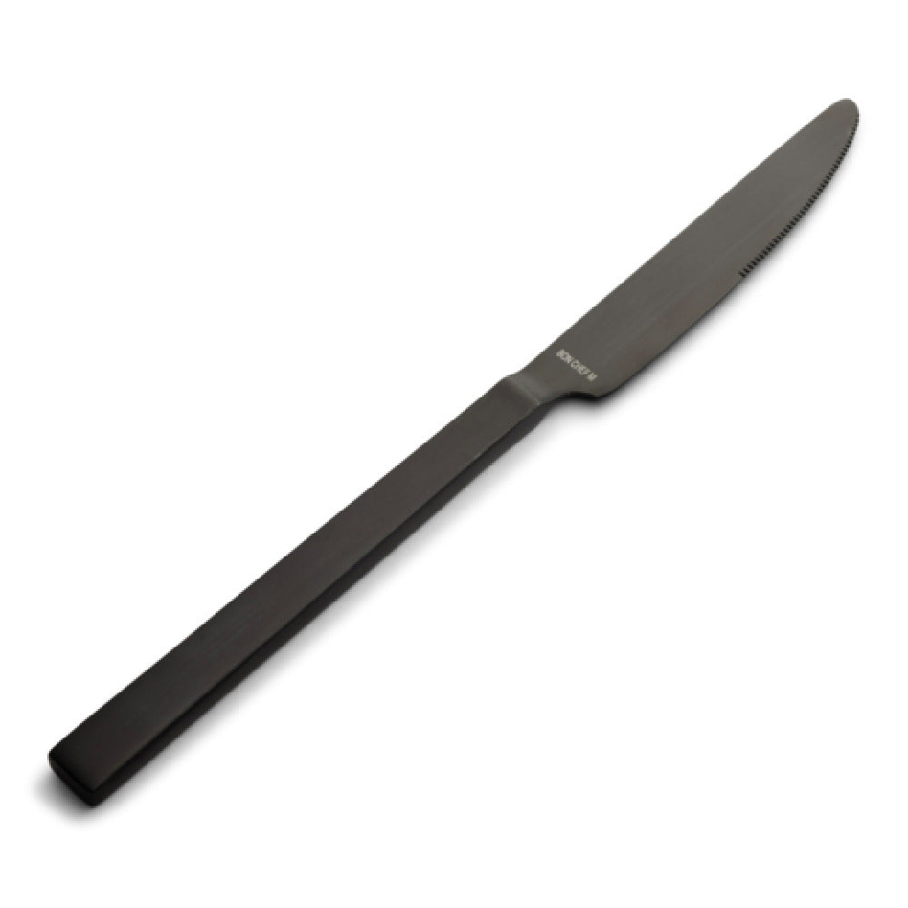 The Bon Chef S3811BM Milan Dinner Knife 9.13" Solid Handle is a premium dining utensil that combines design with functionality, crafted for the discerning culinary professional. Measuring 9.13 inches, this dinner knife is fabricated from 13/0 stainless steel, which ensures durability and long-lasting performance. The solid handle provides a robust grip, enhancing the dining experience by offering balance and precision in handling. A unique feature of this knife is its PVD coating, which not only adds to its aesthetic appeal but also contributes to its resilience against wear and tear. Its black, matte finish exudes sophistication, making it a stylish addition to any table setting, from upscale restaurants to elegant catering events. The technical specifications of this knife cater to the demands of various segments within the food service industry, making it suitable for both high-end establishments and casual dining settings. This product is designed to elevate the dining experience while maintaining the rigorous standards expected in professional environments.