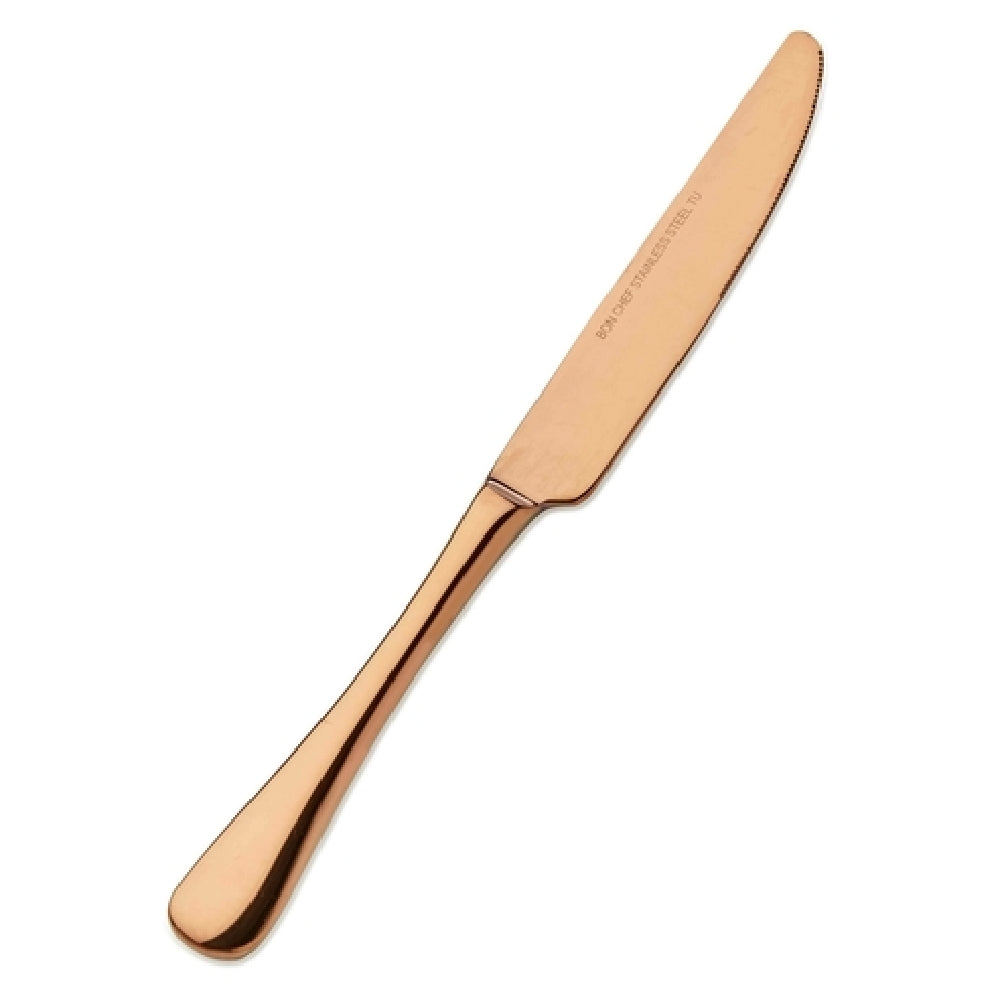 The Bon Chef S4011RG Como Dinner Knife 9-1/8" Solid Handle is a precisely engineered piece of cutlery designed to enhance the dining experience across various settings. Crafted with a solid handle for a firm and balanced grip, this knife provides exceptional ease and comfort during use. Made from 13/0 stainless steel, it is both durable and resistant to corrosion, ensuring longevity and reliability in professional foodservice environments or home dining tables alike. The rose gold finish adds a luxurious aesthetic appeal, making it a standout piece for sophisticated table settings. With a length of 9-1/8 inches, it is perfectly sized for a range of dining tasks, offering versatility for different courses and cuisines. Whether used in a bustling fine dining restaurant or a stylish home dinner party, the Bon Chef S4011RG Como Dinner Knife combines functionality with elegance. Its construction and design meet the needs of various market segments, from hospitality to private chefs, by providing a practical yet visually appealing utensil that complements both modern and traditional tableware. This knife is a testament to Bon Chef's commitment to quality and style, making it an invaluable addition to any cutlery collection.