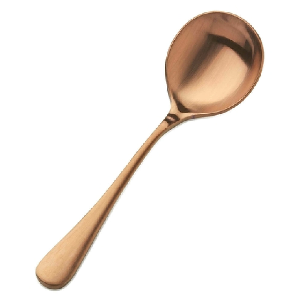 The Bon Chef S4101RGM Como Bouillon Spoon is a meticulously crafted utensil measuring 6-3/8 inches, designed for exceptional performance within both residential and commercial culinary environments. Constructed from high-quality 18/10 stainless steel, this spoon guarantees durability and resistance to corrosion, maintaining its elegant appearance over time even with frequent use. The distinctive rose gold matte finish adds a touch of sophistication and modernity, making it a versatile choice that complements a wide range of table settings. This spoon is ideal for serving broths and soups, providing both functionality and style that cater to the discerning needs of hospitality professionals and home enthusiasts alike. The premium materials and manufacturing precision ensure the Bon Chef S4101RGM Como Bouillon Spoon delivers a high standard of performance, maintaining its luster and effectiveness through daily use and washing cycles. This bouillon spoon represents a fusion of aesthetic appeal and practical design, making it a valuable addition to any dining experience where attention to detail and quality matter.
