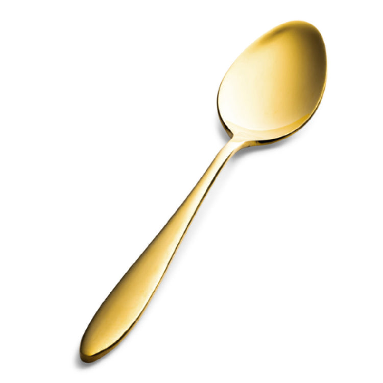 The Bon Chef S4403G Luce Soup/Dessert Spoon, measuring 7.95 inches, is crafted from 18/10 stainless steel, renowned for its superior durability and resistance to corrosion. This makes it an ideal choice for both high-end hospitality venues and everyday dining settings. The spoon boasts a gold mirror finish, imparting an elegant aesthetic that enhances the presentation of any culinary creation, whether it be a sumptuous dessert or a hearty soup. The precise craftsmanship of the Bon Chef S4403G ensures a seamless combination of form and function, with its sleek design offering both comfort and an ergonomic grip. Its high-quality stainless steel composition ensures longevity and maintains a polished appearance even after repeated use and washing. This spoon is versatile, catering to the needs of a diverse range of market segments, including upscale restaurants seeking luxury tableware, as well as home users desiring a touch of sophistication in their cutlery collection. The Bon Chef S4403G Luce Soup/Dessert Spoon exemplifies the brand's commitment to quality and style, making it a valuable addition to any dining experience.