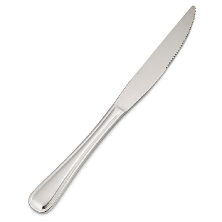 The Bon Chef S4615 Ravello Steak Knife 9.25" Solid Handle is a testament to quality craftsmanship and sophisticated design, tailored for both professional and home culinary settings. This exquisite steak knife is meticulously constructed from 13/0 stainless steel, known for its excellent corrosion resistance and durability, making it a reliable tool in various dining environments. The knife features a mirror finish, adding a touch of elegance and enhancing its aesthetic appeal, which is ideal for upscale dining experiences or enhancing the presentation of any table setting. Its solid handle provides a comfortable grip and superior control, making it practical for chefs who demand precision in cutting. Measuring 9.25 inches, this steak knife is well-suited for effortlessly slicing through meats, ensuring a clean and enjoyable dining experience for guests. The Bon Chef S4615 is versatile enough to meet the needs of steakhouses, restaurants, and caterers, offering a blend of style and functionality that is essential in the food service industry. Its robust design and refined finish make it a valuable addition to any cutlery collection, reflecting both performance and elegance in every use.