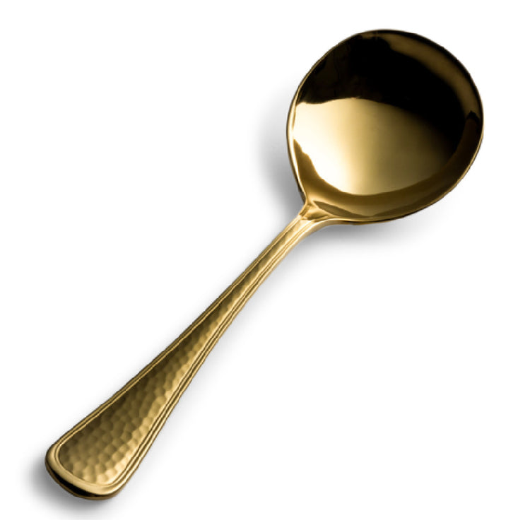The Bon Chef S4701G Positano Bouillion Spoon is a meticulously crafted utensil designed for both elegance and functionality, measuring 6.3 inches in length. Constructed from premium 18/10 stainless steel, this spoon offers superior durability and resistance to corrosion, making it a long-lasting addition to any culinary setting. The striking Gold PVD finish enhances its aesthetic appeal, adding a touch of sophistication to table settings, whether in high-end restaurants or upscale home dining. Its hammered finish not only provides an exquisite texture and visual interest but also aids in a comfortable grip, setting it apart in the cutlery industry. This bouillion spoon is ideally suited for serving soups and broths, making it a versatile choice across multiple dining environments, from luxury hospitality establishments to fine dining experiences. The Bon Chef S4701G Positano Bouillion Spoon exemplifies a perfect blend of style and practicality, catering to the distinct needs of various market segments, including professional chefs, restaurateurs, and discerning home cooks who value quality and design in their culinary tools.