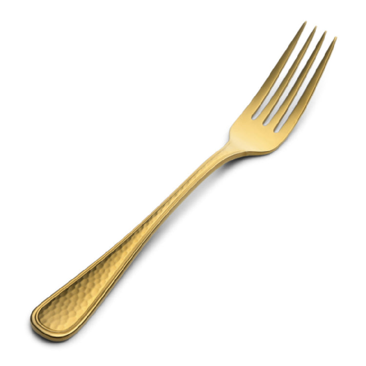 The Bon Chef S4706G Positano Dinner Fork Euro 8.1" stands out as a sophisticated dining utensil, meticulously crafted to meet the demands of high-end dining environments. With a length of 8.1 inches, this fork is designed in the Euro style, providing a substantial feel and balanced handling for a refined dining experience. Manufactured from 18/10 stainless steel, it ensures exceptional durability and resistance to corrosion, making it a reliable choice for both everyday use and special occasions. The fork is adorned with a luxurious gold PVD finish that not only enhances its aesthetic appeal but also adds an extra layer of protection to the stainless steel, ensuring longevity and maintaining its lustrous appearance over time. The hammered finish gives the utensil a unique texture and elegance, appealing to upscale restaurants, hotels, and catering services that seek to impress their guests with distinctive table settings. This dinner fork is an ideal addition to any formal dining setup, offering both functionality and style. Its detailed craftsmanship and premium materials make it a notable choice for industry professionals who value quality and presentation in their dining amenities.