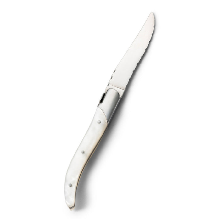 The Bon Chef S945 Laguiole Steak Knife is a meticulously crafted utensil, boasting an overall length of 8-7/8 inches, with a 4-inch blade designed for precision cutting. This knife features a 13/0 stainless steel blade, renowned for its superior durability and resistance to corrosion, making it an ideal choice for both professional chefs and home cooking enthusiasts. The pearl handle enhances its aesthetic appeal, providing an elegant touch to any dining setting. This steak knife is particularly suited for high-end restaurants and catering services where presentation and performance are paramount. Its balanced construction ensures a comfortable grip for effortless cutting, while the razor-sharp blade allows for clean slices, enhancing the dining experience. The Bon Chef S945 is a versatile and sophisticated addition to any cutlery collection, offering a blend of functionality and style that caters to the needs of various market segments within the culinary industry.