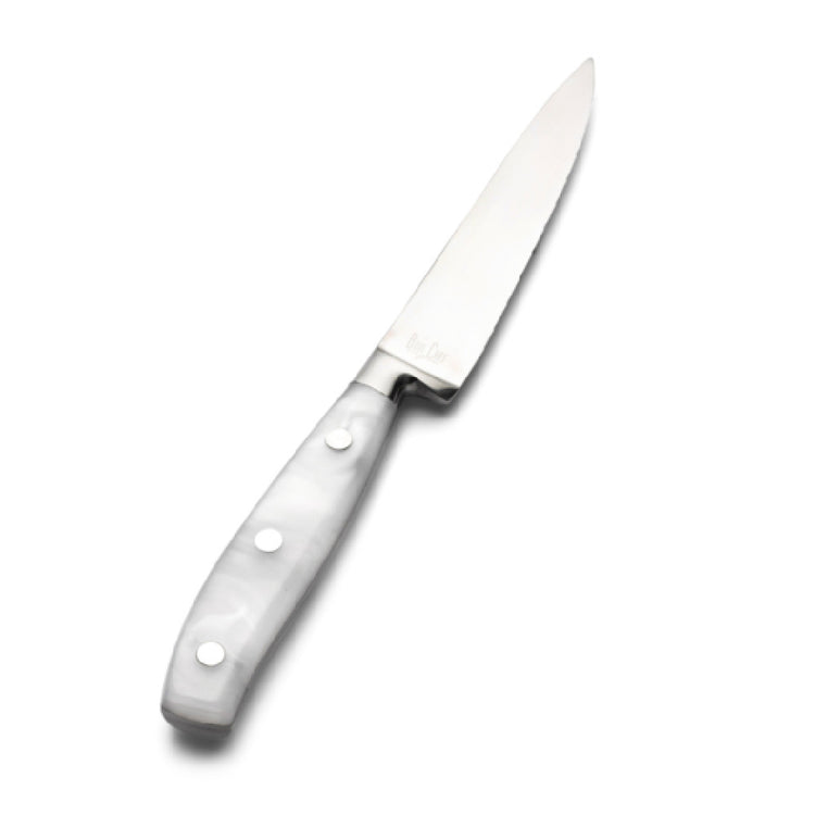 The Bon Chef S950-WHT Steak Knife is a meticulously crafted utensil with a total length of 9.75 inches, featuring a 5-inch micro-serrated pointed tip blade. Made from 13/0 stainless steel, this knife is designed for precision and durability, making it an ideal tool for both professional chefs and home cooks. The micro-serrated blade ensures a superior cutting experience, effortlessly slicing through steaks and other meats with ease. Complementing its functionality, the knife boasts a white swirl acrylic handle, which not only offers an elegant aesthetic but also provides a comfortable and secure grip, making it suitable for extended use in busy kitchen environments. The Bon Chef S950-WHT Steak Knife is a versatile choice within the food service industry, perfectly serving the needs of restaurants, steakhouses, and catering services by delivering consistent, high-quality performance. This knife is a testament to Bon Chef's commitment to combining style with functionality, catering to diverse market segments that demand both efficiency and sophistication in their cutlery. Whether in a bustling restaurant or at a private dining event, this steak knife is engineered to meet the rigorous demands of the culinary world while enhancing the dining experience for guests.