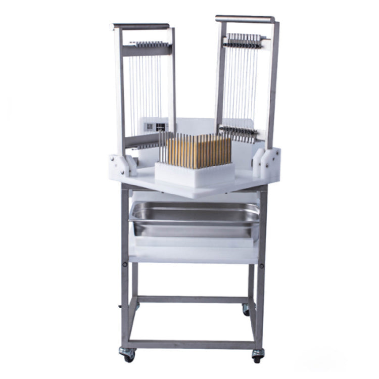 BOSKA Professional Cheese Equipment, 512035, Boska Cheese blocker Pro+ 15 mm, incl. pivot table, 17.32''W x 17.32''D x 35.43''H, Stainless Steel rolling base, plastic wheels, Stainless steel cutting frames, stainless steel cutting wires, HMPE cutting frame base, stainless steel tray, stainless steel posiitoning rods
