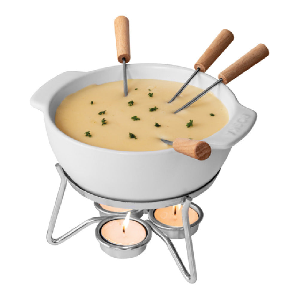 BOSKA Professional Cheese Equipment, 853548, Boska Cheese Fondue Set Party, 8.03''W x 6.14''D x 6.22''H, Ceramic pot, stainless steel forks with beechwood handles, stainless steel base