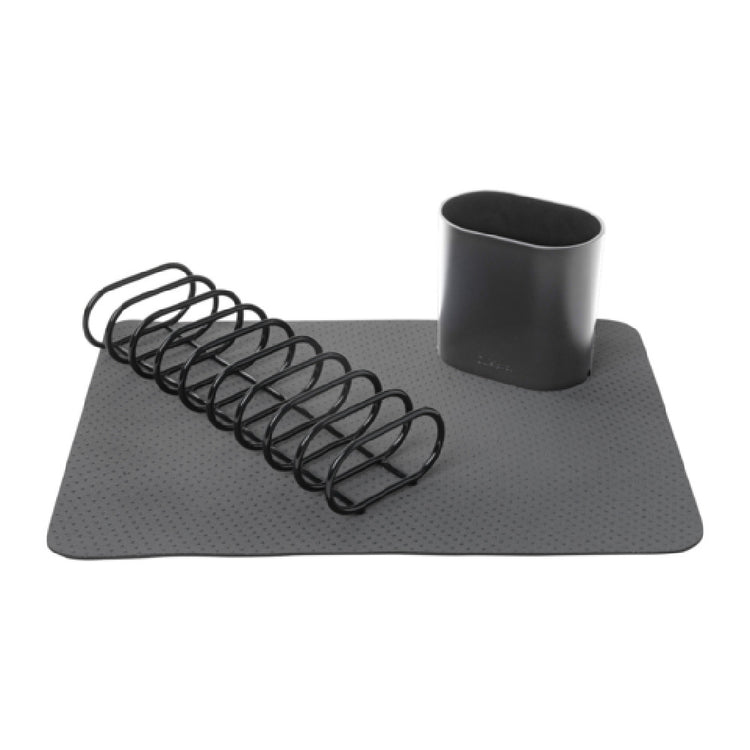 The Browne Foodservice 100902425 CUISIPRO Dish Rack is a compact, durable kitchen accessory designed to enhance the efficiency of your dish drying process. Measuring 13" L x 6" W x 3.5" H, this dish rack is ideal for kitchens with limited countertop space, yet it offers a robust solution for drying dishes. The rubber-coated exterior provides a corrosion-resistant surface, ensuring longevity and ease of maintenance. Featuring a perforated utensil holder, it efficiently organizes and drains cutlery. The dish rack includes a reversible drying mat made from neoprene material, which integrates a nylon anti-slip surface. This dual-sided mat, with one side having a heat tolerance of up to 500 F / 260 C, supports both drying and heat-resistant functions, making it versatile for various kitchen needs. Although it is dishwasher safe, handwashing is preferred to maintain its pristine condition. Finished in a sleek charcoal color, this dish rack combines functionality with modern aesthetics. The Browne Foodservice CUISIPRO Dish Rack's thoughtful design and resilient construction make it a valuable addition to any food service establishment, providing a reliable solution for drying and organizing dishes and utensils efficiently.