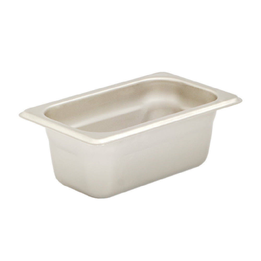 The Browne Foodservice 22194 Steam Table Pan 1/9 Size 1.1 Qt. is a versatile and durable option for professional kitchens, catering services, and foodservice operations. With dimensions of 6-7/8 inches in length, 4-1/4 inches in width, and a depth of 4 inches, this pan is specifically designed to fit into a 1/9 size steam table configuration, making it ideal for efficiently organizing and managing small portions of food. Constructed from high-quality 304 stainless steel, it features a solid, reinforced edge and corners that enhance its durability and longevity. The 22-gauge thickness of the material ensures a robust structure that can withstand the demands of constant use in busy kitchen environments. This steam table pan also incorporates an anti-jam design, which is particularly valuable for quick and easy separation when stacked, thereby saving time and effort during food preparation and service. Additionally, the Browne Foodservice 22194 is NSF certified, highlighting its compliance with industry standards for public health and safety. This certification, combined with its sturdy construction, makes this steam table pan a reliable choice for various segments within the foodservice industry, ensuring it meets the high-performance standards required in professional culinary settings.