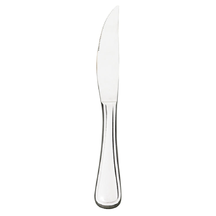 The Browne Foodservice 502412 Concerto Steak Knife is a precision-crafted utensil, designed to enhance the culinary experience for both professionals and home cooks. With a length of 9-3/10 inches, it boasts a sharp, serrated edge that effortlessly slices through even the toughest cuts of meat, ensuring clean and precise cuts every time. The knife is made from 13/0 stainless steel, a material renowned for its durability and resistance to corrosion, making it a long-lasting addition to any cutlery collection. The mirror finish not only adds a touch of elegance to the dining table but also provides a smooth surface that resists staining and is easy to clean. This steak knife is part of the Concerto line, which is known for its balance of style and functionality, making it suitable for upscale restaurants as well as everyday dining. Its ergonomic design ensures comfort during extended use, appealing to chefs who demand both aesthetic appeal and practicality. The Browne Foodservice 502412 Concerto Steak Knife is an essential tool for those who take pride in their kitchenware, offering a harmonious blend of sophistication and performance, tailored for varied market segments within the foodservice industry.