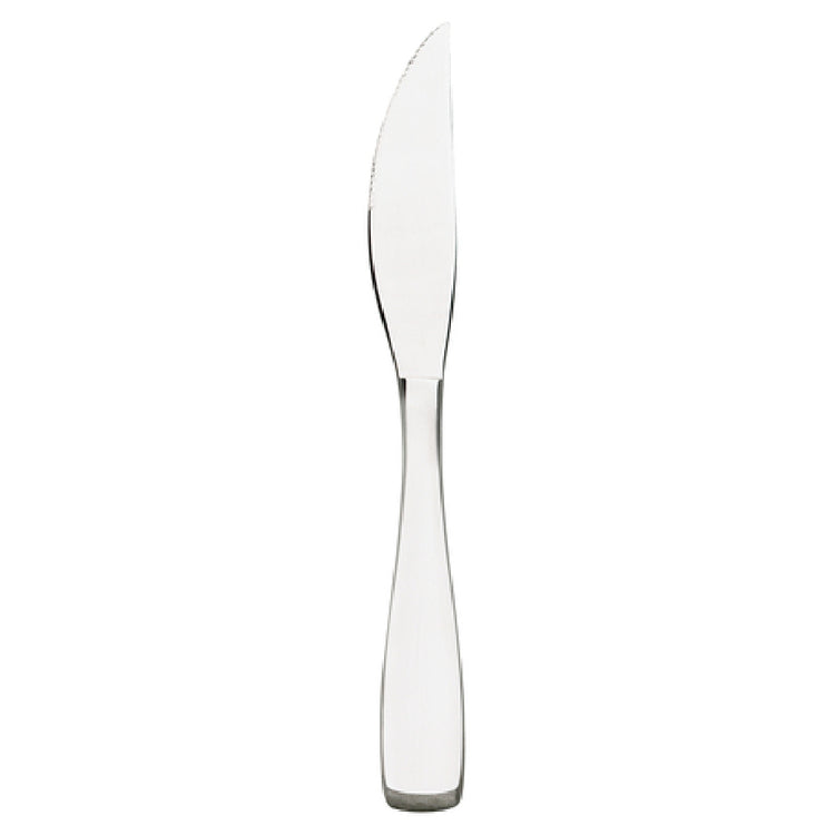 The Browne Foodservice 503012 Modena Steak Knife 9-3/10" Serrated is a precision-crafted utensil designed for both professional and home culinary environments. This knife features a 9-3/10 inch length with a serrated edge, making it ideal for smoothly slicing through steak and other meats. Constructed from 13/0 stainless steel, it ensures durability and resistance to corrosion, essential for maintaining sharpness and longevity in high-use settings. The satin finish adds an elegant touch, enhancing its aesthetic appeal while providing a non-slip grip for safe use. The Browne Foodservice Modena Steak Knife is particularly valuable in restaurant and catering industries, where consistent performance and presentation are crucial. This knife's superior design caters to chefs and foodservice professionals who demand reliability and quality in their kitchen tools. Additionally, its robust construction makes it a perfect fit for high-volume food service operations, where efficiency and product lifespan are key considerations. Whether for casual dining or upscale venues, this steak knife delivers exceptional cutting performance, contributing to a refined dining experience.