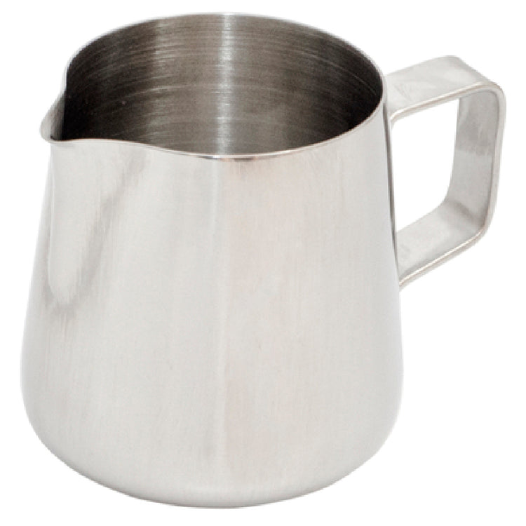 The Browne Foodservice 515007 Contemporary Milk Frother-12 oz.-4-1/2" x 3-3/8"-is a versatile kitchen tool designed for both professional and home baristas seeking precision and quality in milk frothing. With its 12 oz. capacity, this milk frother offers ample volume for crafting multiple servings of frothed milk, making it suitable for busy cafes or coffee enthusiasts at home. Its dimensions of 4-1/2" x 3-3/8" ensure that it is compact yet efficient, fitting seamlessly on any countertop. The frother features a tapered spout, allowing for precise pouring, essential for creating intricate latte art or evenly distributing foam in a cappuccino. Its wide bottom enhances stability during use, preventing spills and ensuring safety. The large handle offers a comfortable grip, making it easy to maneuver even during extended use. Constructed from 18/8 stainless steel, the frother is durable and resistant to corrosion, while its mirror finish adds a touch of elegance to any kitchen setting. Being dishwasher safe, it offers convenience for busy food service operations or for the home enthusiast who values ease of maintenance. This milk frother stands out as a reliable and stylish choice for any setting that demands high-quality milk frothing.