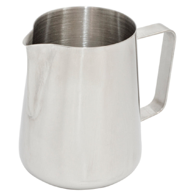 The Browne Foodservice 515012 Contemporary Milk Frother is a high-quality, durable kitchen tool designed for both professional and home use. With a generous 48 oz. capacity, this frother is perfect for crafting multiple servings of creamy frothed milk, making it ideal for busy coffee shops or family gatherings. The dimensions of 6-1/2" x 6" provide a compact yet ample space for frothing, while the tapered spout ensures precision pouring, minimizing spills. The wide bottom design contributes to stability during use, and the large handle offers a comfortable grip, enhancing usability. Crafted from 18/8 stainless steel, this milk frother features a mirror finish, adding a touch of contemporary elegance to any kitchen setting. Its dishwasher safe nature guarantees easy cleaning, making it practical for daily use. This combination of features makes the Browne Foodservice 515012 an attractive choice for various market segments, from small coffee shops seeking reliable equipment to home baristas desiring a professional-grade tool. Its robust construction and thoughtful design highlight its value proposition, blending aesthetics with functionality to meet diverse frothing needs efficiently and effectively.