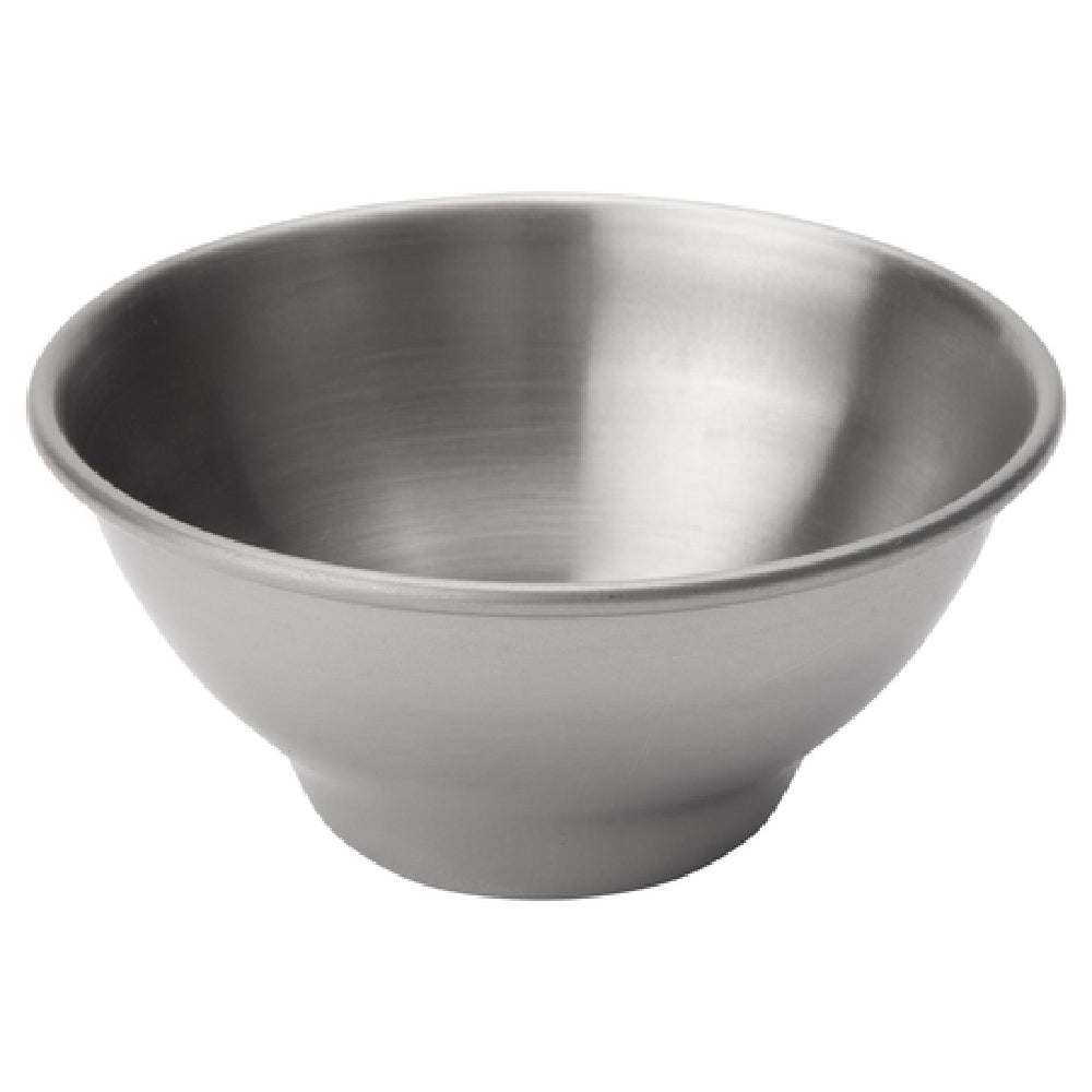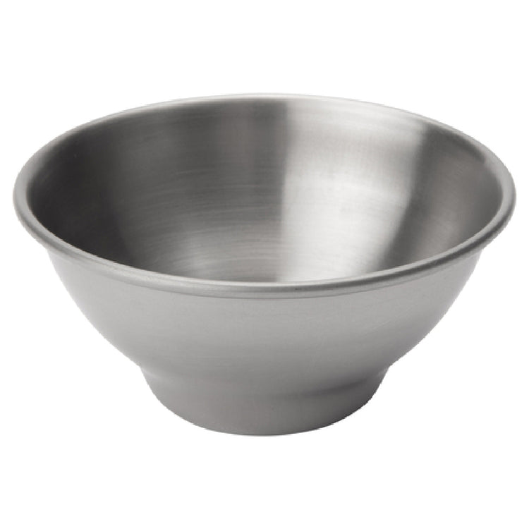 The Browne Foodservice 515045 Sauce Cup 2 Oz. 2-5/8" Dia. x 1-3/16"H is the quintessential choice for establishments requiring durable and professional condiment presentation solutions. This sauce cup, made from high-quality 18/8 stainless steel, boasts a mirror finish exterior and a satin finish interior, enhancing both its aesthetic appeal and its durability. With a 2-ounce capacity, it is ideally suited for single servings of sauces or condiments, catering to the precise needs of individual diners in both casual and fine dining scenarios. Its round shape and stackable design, featuring a footed rim, ensure efficient storage and easy handling, making it a practical addition to any busy kitchen or service area. The dishwasher-safe property of this sauce cup simplifies maintenance, ensuring that it remains in pristine condition with minimal effort. Its dimensions - 2-5/8 inches in diameter and 1-3/16 inches in height - contribute to its versatility, fitting seamlessly into varied table settings while providing ample space for a variety of sauces. The Browne Foodservice 515045 Sauce Cup is a valuable tool for restaurants, catering businesses, and any food service operation that values both presentation and functionality in their serviceware.