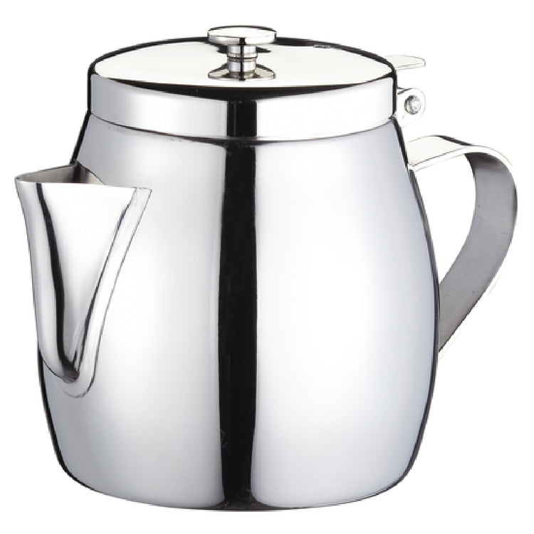 The Browne Foodservice 515262 Teapot 10 Oz. Stackable is a meticulously designed piece of kitchenware, crafted to meet the multifaceted demands of the foodservice industry. Engineered with an 18/10 stainless steel composition, this teapot guarantees durability and a high resistance to corrosion, making it an ideal choice for both professional kitchens and home use. Its 10-ounce capacity strikes a balance between elegance and practicality, catering to small to medium-sized servings of tea. A unique selling point of this teapot is its stackable design, optimizing space in busy kitchen environments where storage efficiency is paramount. It includes a built-in strainer, enhancing user convenience by facilitating easy pouring while keeping tea leaves contained. Packaged in a "cash & carry" format, it is readily available for immediate use or retail sale. This product's thoughtful design and high-quality materials make it a valuable asset for cafes, restaurants, and hospitality establishments seeking reliable and stylish teapots. The Browne Foodservice 515262 Teapot embodies functional elegance, offering a seamless blend of utility and aesthetic appeal, suitable for a variety of market segments within the foodservice industry.