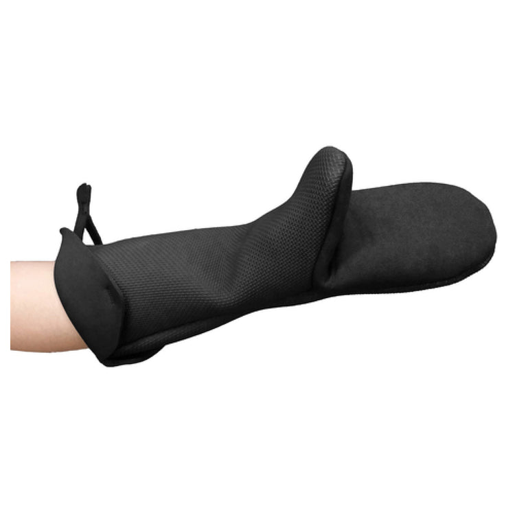 The Browne Foodservice 5443502 KitchenGrips® Puppet Mitt 15" is a uniquely designed kitchen tool crafted with FLXaPrene™ and featuring a flame-retardant palm made from Nomex®. This high-performance mitt provides exceptional heat protection, capable of withstanding temperatures ranging from -134°F to 500°F, making it suitable for a wide array of culinary environments. Its construction includes water-repellent properties and a non-slip grip, ensuring both safety and practicality in handling hot items. Additionally, the mitt is stain resistant and dishwasher safe, contributing to its durability and ease of maintenance. Available in a sleek black color, it is packaged for cash and carry, appealing to both professional chefs and home cooking enthusiasts. The Browne Foodservice Puppet Mitt is a versatile and essential accessory for any kitchen, offering a combination of advanced materials and thoughtful design to meet the demands of the foodservice industry.