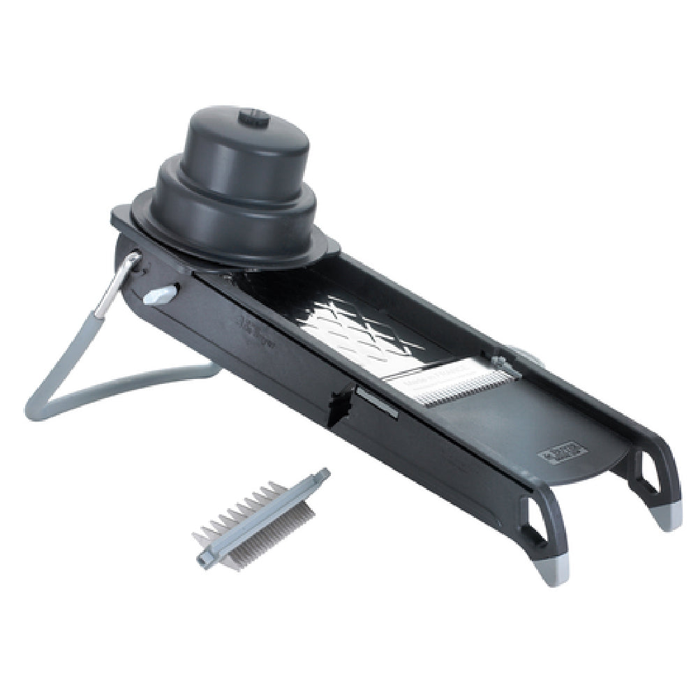 The Browne Foodservice 5710201 Mandoline Protective Guard is specifically designed for compatibility with the 5715000 model, ensuring a seamless integration for enhanced kitchen safety. This protective guard acts as a crucial accessory by providing an additional layer of protection, minimizing the risk of accidental injuries during mandoline operation. Constructed with durable materials, the 5710201 guard is engineered to withstand the demands of professional foodservice environments. Its design is centered around user safety, making it a necessary tool for kitchens where precision slicing is frequent. The guard's compatibility with the 5715000 unit underscores its tailored functionality, making it an indispensable addition to professional chefs and home cooking enthusiasts alike who use the Browne mandoline slicer. Ideal for culinary professionals in restaurants, catering services, or any food preparation setting, the Browne Foodservice 5710201 Mandoline Protective Guard exemplifies a commitment to safety and quality, addressing the common industry need for reliable protective tools in food preparation. This accessory not only enhances user confidence but also ensures compliance with kitchen safety protocols by reducing the likelihood of injuries while maintaining efficiency in food slicing tasks.