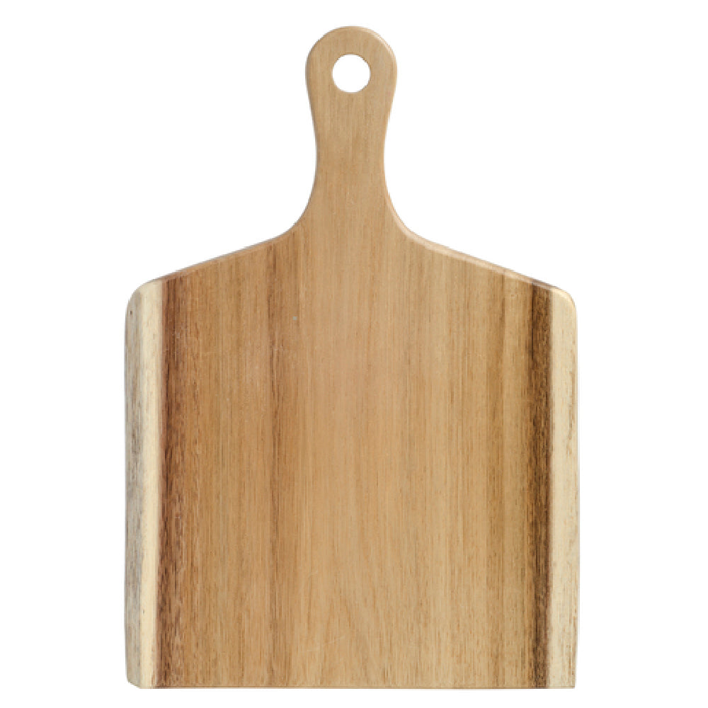 The Browne Foodservice 571610 Serving Board - 16" x 10" Rectangular is a meticulously crafted kitchen essential, designed to elevate presentation standards with its elegant dimensions and resilient material. This serving board is constructed from solid acacia wood, renowned for its durability and rich woodgrain pattern, which adds a touch of natural sophistication to any setting. Measuring approximately 16 inches by 10 inches, the board provides ample space for serving an array of dishes, from appetizers to desserts. Its rectangular shape with an integrated handle offers ease of transport, making it an ideal choice for both professional and home use. Each piece is unique due to natural variations in woodgrain, ensuring that every board is a distinctive work of art. The board is finished with a food-safe protective varnish, enhancing its longevity and ensuring it is safe for direct food contact. This makes it a versatile tool for the foodservice industry, suitable for upscale restaurants, catering events, or home dining experiences that require a blend of functionality and style. The Browne Foodservice 571610 Serving Board embodies a perfect balance of form and function, catering to diverse market segments by meeting the aesthetic and practical demands of modern food presentation.