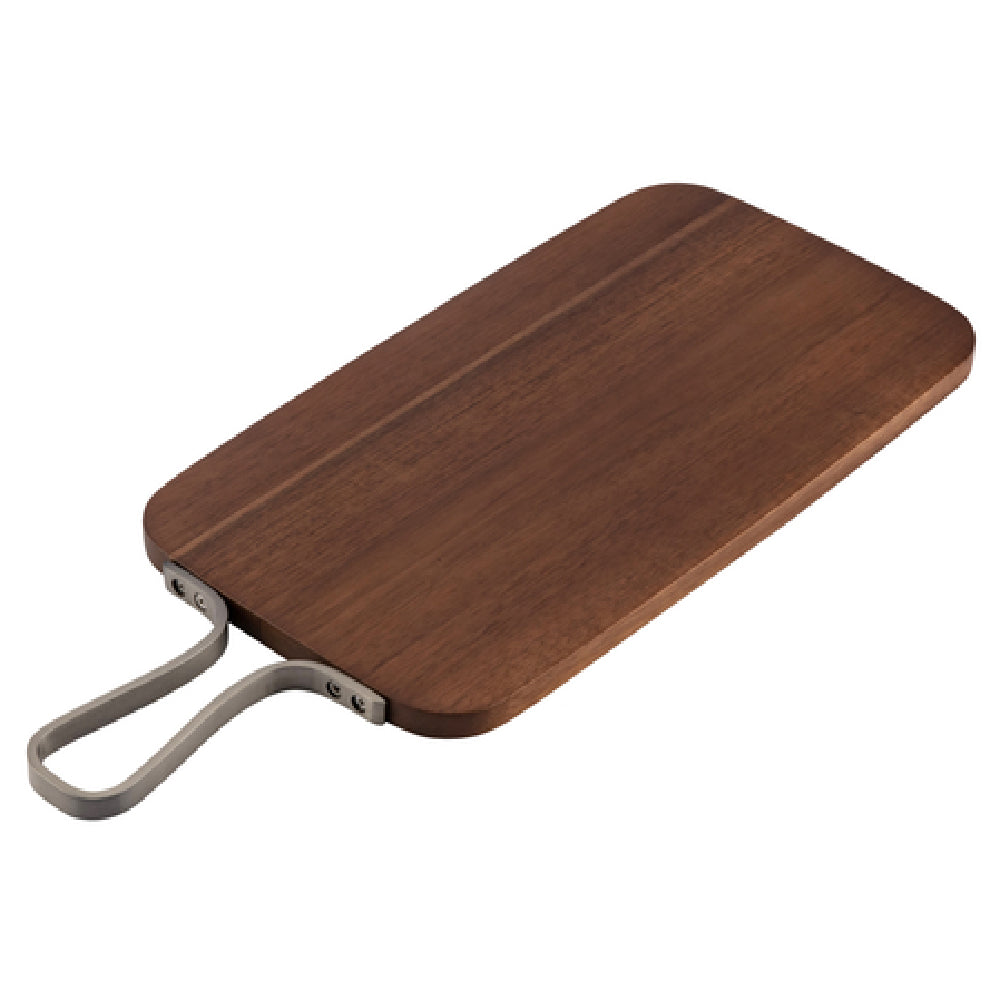 The Browne Foodservice 571808 Serving Board 15" X 8-1/2" Rectangular is a meticulously crafted serving accessory perfect for a variety of settings, from upscale dining establishments to casual eateries. With dimensions of 15 inches by 8-1/2 inches, this serving board provides ample space for presenting a wide array of culinary creations. Its construction from solid acacia wood gives it a durable and visually appealing walnut finish, making it a stylish addition to any table setting. The board is reversible, allowing for versatile use and extended longevity. A standout feature is the stainless steel handle, attached with plated screws, ensuring a sturdy and reliable grip. This design element not only enhances its practicality but also its aesthetic appeal. For added safety and durability, the board is treated with a food-safe protective varnish, preserving the natural beauty of the woodgrain, which may vary with each piece. Notably, the board requires hand washing to maintain its quality, emphasizing its bespoke nature. Suitable for different market segments within the foodservice industry, this serving board is an ideal choice for those seeking a blend of functionality and elegance in their presentation tools.