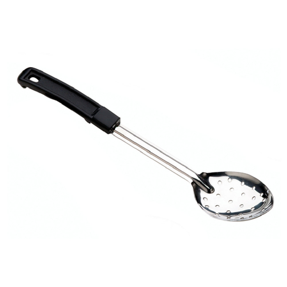 The Browne Foodservice 572352 Serving Spoon 15" Perforated is a meticulously engineered kitchen tool designed for efficiency and durability, essential for food service professionals across various market segments. Crafted with a 15-inch length, this serving spoon provides ample reach, making it suitable for both small and large-scale operations. The perforated design facilitates effective draining of liquids, enhancing its utility in diverse culinary applications such as serving pasta or vegetables. This serving spoon features a black polypropylene handle, which not only offers a comfortable and secure grip but is durable enough to withstand the rigors of frequent use in bustling kitchen environments. The handle includes a convenient hanging hole for easy storage, optimizing space in busy kitchens. The spoon is constructed with a 1.5 mm thickness stainless steel, ensuring robustness and longevity, even with constant exposure to heat and moisture. The stainless steel material also guarantees resistance to corrosion, maintaining the spoon's pristine condition over time. The Browne Foodservice 572352 Serving Spoon is a valuable addition for restaurants, catering services, and hospitality businesses seeking reliable kitchen tools that support high standards of performance and hygiene.