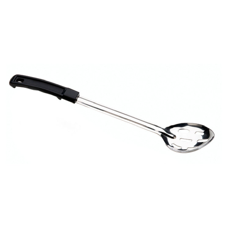 The Browne Foodservice 572353 Serving Spoon 15" Slotted is an essential utensil for any foodservice operation, known for its precise design and functionality. At 15 inches in length, this serving spoon is perfectly sized for reaching into deep pots or serving dishes, ensuring ease of use in bustling commercial kitchen environments. The slotted design efficiently drains excess liquid from food, making it ideal for serving dishes such as vegetables, pasta, or poached items. Crafted with a 1.5 mm thick stainless steel head, it guarantees durability and long-lasting performance, even with frequent use. The handle, made from black polypropylene, is ergonomically designed to provide a comfortable and secure grip, reducing user fatigue during extended service periods. Additionally, the handle features a convenient hanging hole, allowing for easy storage and accessibility in busy kitchen settings. This serving spoon is a versatile tool suitable for a variety of market segments, including restaurants, catering services, and institutional kitchens, where efficiency and reliability are crucial. Its robust construction and practical design make the Browne Foodservice 572353 Serving Spoon a valuable addition to any professional kitchen, where precise and efficient food service is paramount.