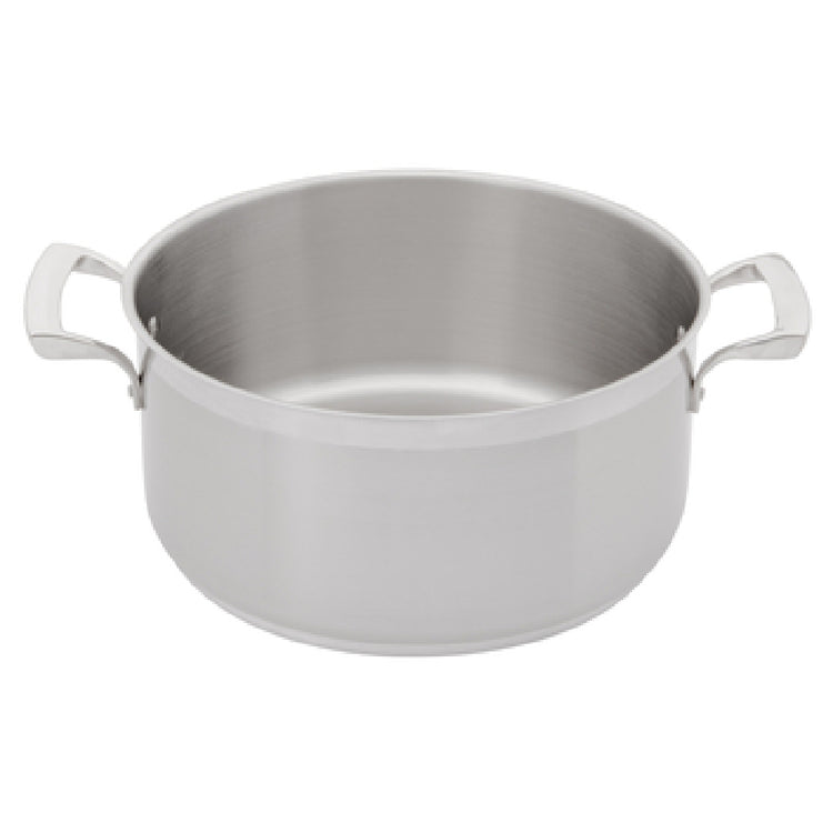 The Browne Foodservice 5724009 Thermalloy® Brazier 8 Qt. - 11" X 5"H is a high-quality cooking vessel designed for professional kitchens and culinary enthusiasts. Crafted from durable stainless steel, this brazier features a 1/4" aluminum core, ensuring excellent heat distribution and retention for consistent cooking results. With a generous 8-quart capacity, it is ideal for preparing large quantities of stews, sauces, and braised dishes. The brazier is equipped with two oversized stay-cool hollow cast riveted handles, making it easy to maneuver and transport, even when filled. Its versatile design supports multiple heat sources, including gas, electric, ceramic, halogen, and induction, making it a flexible choice for diverse kitchen environments. The natural finish and NSF certification highlight the product's adherence to safety and sanitation standards, ensuring it is suitable for commercial food service use. While it does not include a cover, the brazier's robust construction and efficient design make it a valuable addition to any kitchen. This product's cash and carry packaging further emphasizes its convenience and practicality for foodservice professionals seeking reliable cookware solutions.