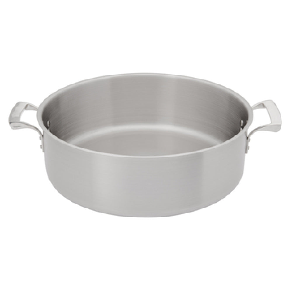 The Browne Foodservice 5724024 Thermalloy® Brazier is a versatile and durable cooking vessel with a substantial capacity of 25 quarts, making it suitable for various professional culinary applications. Measuring 17-4/5 inches in diameter and 5-4/5 inches in height, this brazier is designed to accommodate large-scale cooking while ensuring even heat distribution. Constructed from stainless steel with a 1/4 inch aluminum core, it provides superior thermal conductivity and durability. The brazier features two oversized stay-cool hollow cast riveted handles, allowing for safe and comfortable handling while in use. This product is compatible with a wide range of heat sources, including gas, electric, ceramic, halogen, and induction, offering flexibility in different kitchen environments. With its natural finish, the Brazier is both aesthetically pleasing and functional, and it is NSF certified, ensuring it meets high standards for public health and safety. It is packaged for cash and carry purposes, making it accessible and convenient for foodservice operations. Whether used in a bustling restaurant kitchen or a catering service, the Browne Foodservice 5724024 Thermalloy® Brazier stands out as a reliable and efficient choice for chefs seeking quality and performance.