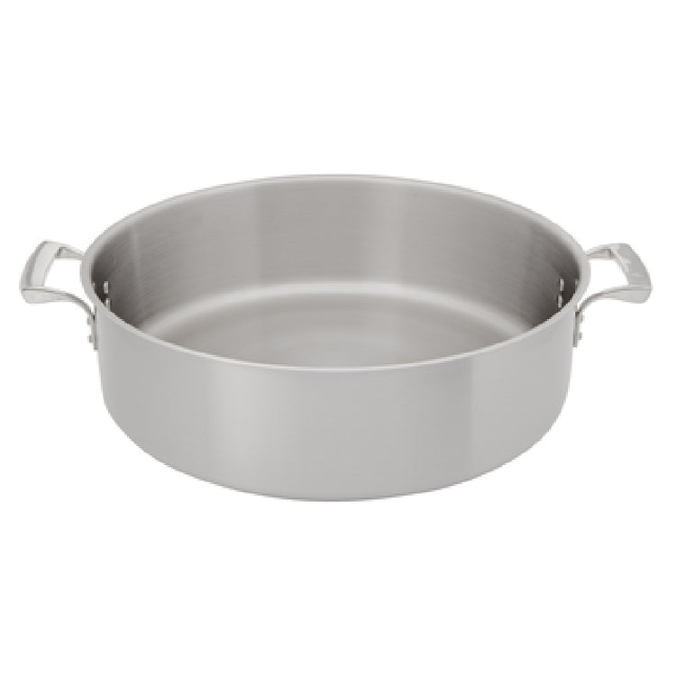 The Browne Foodservice 5724029 Thermalloy® Brazier - 30 Qt. 19-1/2" X 5-4/5"H is a versatile cooking essential designed for professional kitchens and catering operations. This brazier stands out for its substantial 30-quart capacity, making it ideal for preparing large quantities of soups, stews, and braised dishes. Featuring a dimension of 19-1/2 inches in diameter and a height of 5-4/5 inches, it provides ample space for efficient cooking. The brazier is constructed from stainless steel with a 1/4-inch aluminum core, ensuring optimal heat distribution and durability. It is compatible with various heat sources including gas, electric, ceramic, halogen, and induction, offering flexibility in diverse kitchen environments. The two oversized hollow cast riveted handles are designed to stay cool for safe and easy maneuverability. Although sold without a cover, the brazier's natural finish enhances its aesthetic appeal and ease of cleaning. The NSF certification signifies its compliance with public health standards, making it suitable for commercial kitchens. Packaged for cash-and-carry convenience, the Browne Foodservice Thermalloy® Brazier is a reliable choice for chefs and foodservice professionals seeking efficient and durable cookware solutions.