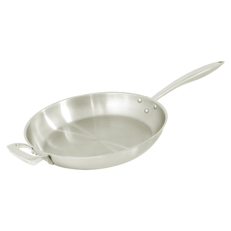 The Browne Foodservice 5724054 Thermalloy® Deluxe Fry Pan 14" Dia. x 2-3/10" Without Cover is a versatile and robust cooking tool, ideal for diverse culinary environments. With a diameter of 14 inches and a height of 2-3/10 inches, this fry pan offers ample space for cooking large quantities, making it suitable for both professional kitchens and home cooks who value efficiency. Crafted from stainless steel and featuring a 1/4" aluminum core, it ensures even heat distribution and durability, accommodating various cooking techniques. The pan is compatible with multiple heat sources, including gas, electric, ceramic, halogen, and induction, enhancing its adaptability across different kitchen setups. It includes a stay-cool hollow cast riveted handle and an additional helper handle, both designed for safety and ease of handling during use. The natural finish adds to its aesthetic appeal, while the NSF certification guarantees its compliance with public health standards. The cash and carry packaging emphasizes convenience in purchasing and transportation. This fry pan represents a valuable asset for those in the food service industry who require reliable, high-performance cookware that meets rigorous standards of quality and functionality.