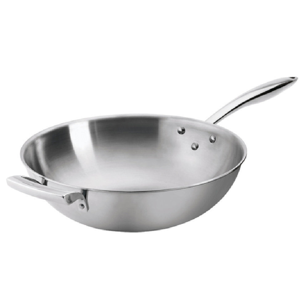 The Browne Foodservice 5724100 Thermalloy® Wok is a professional-grade kitchen essential designed for diverse culinary applications. With a substantial capacity of 9 quarts, this wok measures 14 inches in diameter and 3-1/2 inches in height, providing ample space for cooking large quantities. It is constructed from tri-ply stainless steel with an aluminum core, ensuring even heat distribution and durability. The wok's natural finish contributes to its sleek appearance and easy maintenance. Designed for versatility, it is compatible with various heat sources including gas, electric, ceramic, halogen, and induction, making it suitable for a wide range of cooking environments. The handle is secured with off-set rivets, enhancing stability and safety during use. While it does not come with a cover, this wok is NSF certified, which guarantees that it meets public health and safety standards. The cash & carry packaging ensures convenient storage and transportation. This wok is an excellent choice for chefs and cooking enthusiasts who require a reliable and high-performing piece of cookware for their professional or personal kitchens.