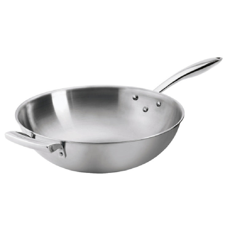 - Tri-ply stainless steel with aluminum core for even heat distribution