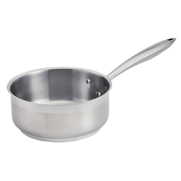 The Browne Foodservice 5724161 Thermalloy® Low Sauce Pan is a 1-1/2 quart capacity kitchen essential, specifically designed to meet the diverse needs of professional chefs and home cooks alike. With a 6-inch diameter and a height of 3-1/5 inches, this sauce pan is engineered for versatility across various cooking platforms, including gas, electric, ceramic, halogen, and induction cooktops. Constructed from high-quality stainless steel, it features a 1/4-inch aluminum core that ensures even heat distribution for precise cooking results. The natural finish offers a sleek, professional appearance, making it a valuable addition to any culinary setup. The stay-cool hollow cast riveted handle provides both safety and durability, allowing for a secure grip even when the pan is heated. Although this model does not include a cover, its design ensures optimal functionality and ease of use. The Browne Foodservice 5724161 is NSF certified, reflecting its adherence to strict public health and safety standards, and it comes in cash and carry packaging for convenient transport. This low sauce pan is an excellent choice for those in the food service industry seeking reliable cookware that combines technical precision with practical applications.