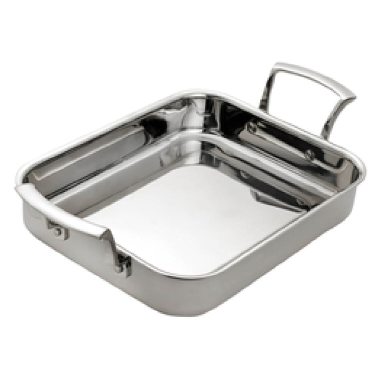 The Browne Foodservice 5724175 Thermalloy® Roast Pan is a versatile kitchen essential with a capacity of 3 qt. (2.8 liters), making it suitable for various cooking tasks across different culinary segments. Its dimensions are 11" x 8-7/10" x 2", providing ample space for roasting and baking needs. This rectangular pan is crafted from tri-ply stainless steel with an aluminum core, ensuring even heat distribution for consistent cooking results. Its natural finish enhances durability while maintaining a professional appearance. Designed for compatibility with multiple heat sources, it operates seamlessly with gas, electric, ceramic, halogen, and induction cooktops, offering flexibility for diverse cooking environments. The pan is equipped with two riveted ergonomic handles, facilitating safe and comfortable handling, even when transferring from stovetop to oven. NSF certification guarantees compliance with health and safety standards, affirming its suitability for professional foodservice operations. The Browne Foodservice Thermalloy® Roast Pan is an excellent choice for chefs and culinary professionals who demand reliability and performance in their cookware, supporting efficient kitchen operations with its robust design and multi-functional capabilities.