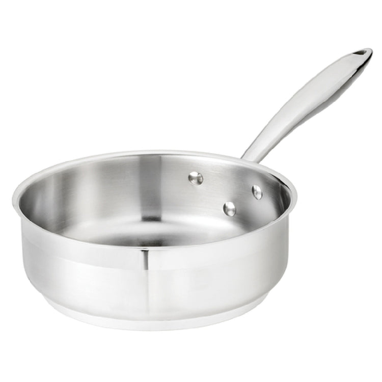 The Browne Foodservice 5724180 Thermalloy® Sauté Pan 2 Qt. 8" Dia. x 2-9/10"H is a premium cooking essential designed for versatility in professional and home kitchens. This sauté pan boasts a substantial 2-quart capacity and dimensions of 8 inches in diameter by 2-9/10 inches in height, making it suitable for a variety of culinary tasks. It features a riveted stay-cool handle, ensuring safety and comfort during use. The pan is engineered to be compatible with multiple heat sources, including gas, electric, ceramic, halogen, and induction cooktops, offering flexibility for diverse cooking environments. The 1/4-inch (6mm) aluminum sandwich bottom ensures even heat distribution, preventing hotspots and enhancing cooking performance. Constructed with durable stainless steel, this sauté pan is not only resilient but also easy to maintain. The Browne Foodservice Thermalloy® Sauté Pan is NSF certified, signifying its compliance with strict public health and safety standards. Its robust design and versatile compatibility make it an excellent choice for chefs seeking a reliable and efficient cookware solution in various food service settings, from restaurants to catering businesses.
