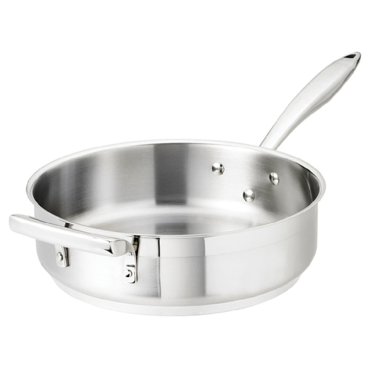 The Browne Foodservice 5724182 Thermalloy® Sauté Pan is a versatile kitchen essential designed to meet the demands of professional chefs and home cooks alike. With a capacity of 4 quarts and dimensions of 11 inches in diameter and 2-9/10 inches in height, this pan is ideal for preparing a wide range of dishes. Its straight-sided design facilitates even cooking and easy stirring. Constructed from durable stainless steel, it features a 1/4 inch aluminum core that ensures quick and uniform heat distribution across its surface, making it suitable for various cooking techniques. The pan is equipped with a stay-cool hollow cast riveted handle, providing a comfortable grip and increased safety during use, and a helper handle for additional support when lifting. This sauté pan is compatible with multiple heat sources, including gas, electric, ceramic, halogen, and induction cooktops, offering flexibility and convenience to diverse culinary environments. Its natural finish enhances its aesthetic appeal while ensuring easy maintenance. Additionally, the Browne Foodservice Thermalloy® Sauté Pan is NSF certified, assuring compliance with strict health and safety standards. Whether in a bustling restaurant kitchen or a home setting, this sauté pan embodies reliability and high-performance cooking.