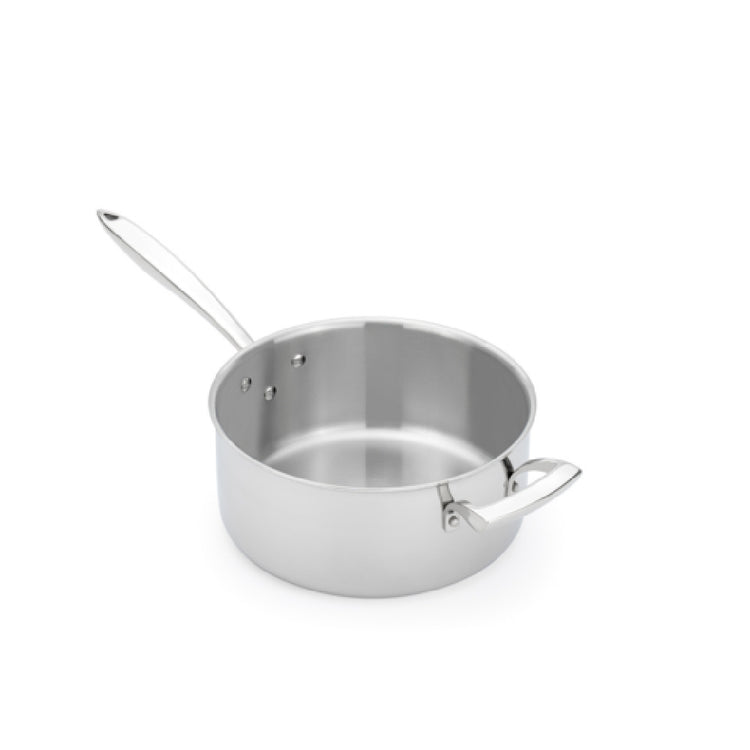 The Browne Foodservice 5724205 Thermalloy® Sauce Pan is a versatile kitchen essential, boasting a 5-quart capacity and measuring 9 inches in diameter by 4.3 inches in height. This product is crafted without a cover and features a stay-cool hollow cast riveted handle along with a helper handle, enhancing usability and safety. Designed for compatibility with a variety of heat sources including gas, electric, ceramic, halogen, and induction, this sauce pan offers flexibility in diverse cooking environments. Constructed with tri-ply stainless steel and an aluminum core, it ensures efficient heat distribution and durability. The satin finish interior is complemented by a mirror finish exterior, adding a touch of elegance to its robust functionality. NSF certified, it meets stringent health and safety standards, making it a reliable choice for commercial kitchens. Ideal for chefs seeking consistency and quality, this Thermalloy® Sauce Pan is perfect for both professional and home cooking applications. Its thoughtful design and high-quality materials make it a valuable asset for any foodservice operation, underlining its importance across different market segments within the culinary industry.
